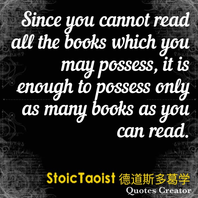 Possession February 28, 2019March 6, 2019 / StoicTaoist (Always Be Confident) Since you cannot read all the books which you may possess, it is enough to possess only as many books as you can read. Share this: Click to share on X (Opens in new window) X Click to share on WhatsApp (Opens in new window) WhatsApp Click to share on Facebook (Opens in new window) Facebook Click to share on Pocket (Opens in new window) Pocket Click to email a link to a friend (Opens in new window) Email Click to share on LinkedIn (Opens in new window) LinkedIn Click to share on Telegram (Opens in new window) Telegram More Click to share on Reddit (Opens in new window) Reddit Click to share on Tumblr (Opens in new window) Tumblr Click to share on Pinterest (Opens in new window) Pinterest Like Loading... Related