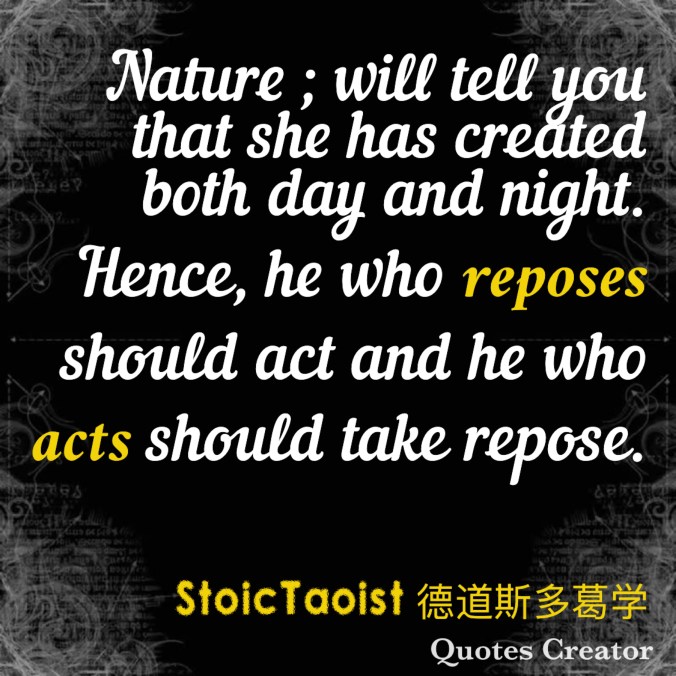 Nature ; will tell you that she has created both day and night. Hence, he who reposes should act and he who acts should take repose.