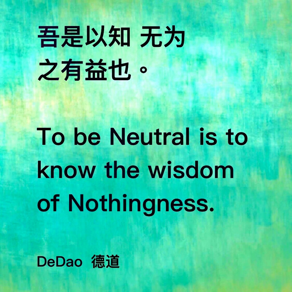 无为 Neutral March 2, 2020March 2, 2020 / StoicTaoist (Always Be Confident) Neutral 吾是以知 无为 之有益也。 To be Neutral is to know the wisdom of nothingness. Neutral is Nothingness Share this: Click to share on X (Opens in new window) X Click to share on WhatsApp (Opens in new window) WhatsApp Click to share on Facebook (Opens in new window) Facebook Click to share on Pocket (Opens in new window) Pocket Click to email a link to a friend (Opens in new window) Email Click to share on LinkedIn (Opens in new window) LinkedIn Click to share on Telegram (Opens in new window) Telegram More Click to share on Reddit (Opens in new window) Reddit Click to share on Tumblr (Opens in new window) Tumblr Click to share on Pinterest (Opens in new window) Pinterest Like Loading... Related