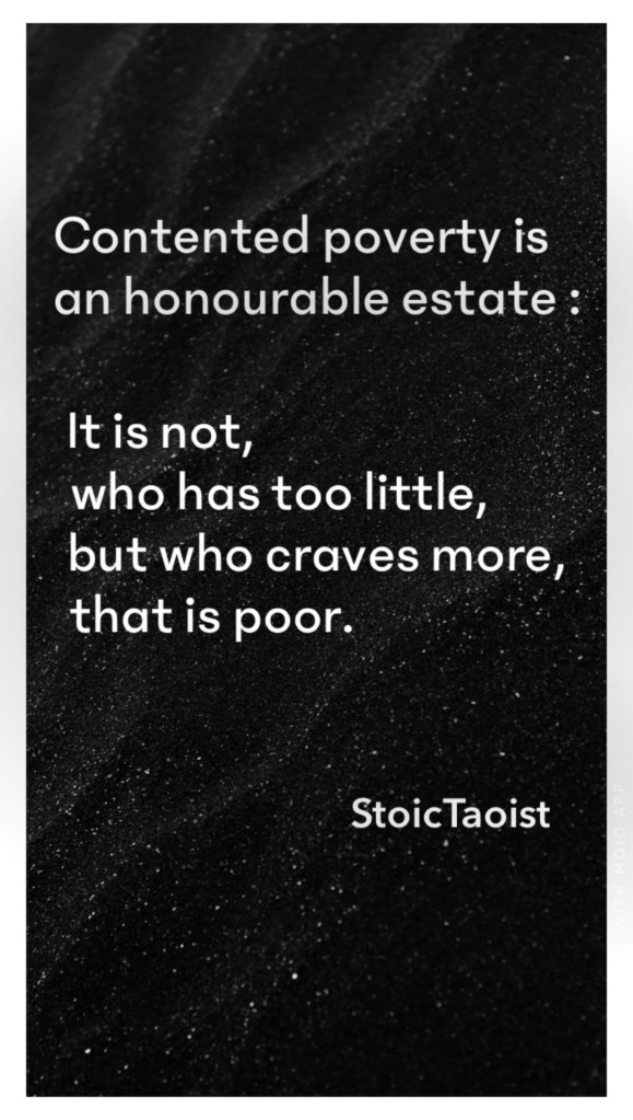 Contented Cravings March 8, 2021April 16, 2021 / StoicTaoist (Always Be Confident) Contented poverty is an honourable estate: It is not, who has too little, but who craves more, that is poor. https://youtu.be/lRZBOqhsVqM Contented Cravings Share this: Click to share on X (Opens in new window) X Click to share on WhatsApp (Opens in new window) WhatsApp Click to share on Facebook (Opens in new window) Facebook Click to share on Pocket (Opens in new window) Pocket Click to email a link to a friend (Opens in new window) Email Click to share on LinkedIn (Opens in new window) LinkedIn Click to share on Telegram (Opens in new window) Telegram More Click to share on Reddit (Opens in new window) Reddit Click to share on Tumblr (Opens in new window) Tumblr Click to share on Pinterest (Opens in new window) Pinterest Like Loading... Related